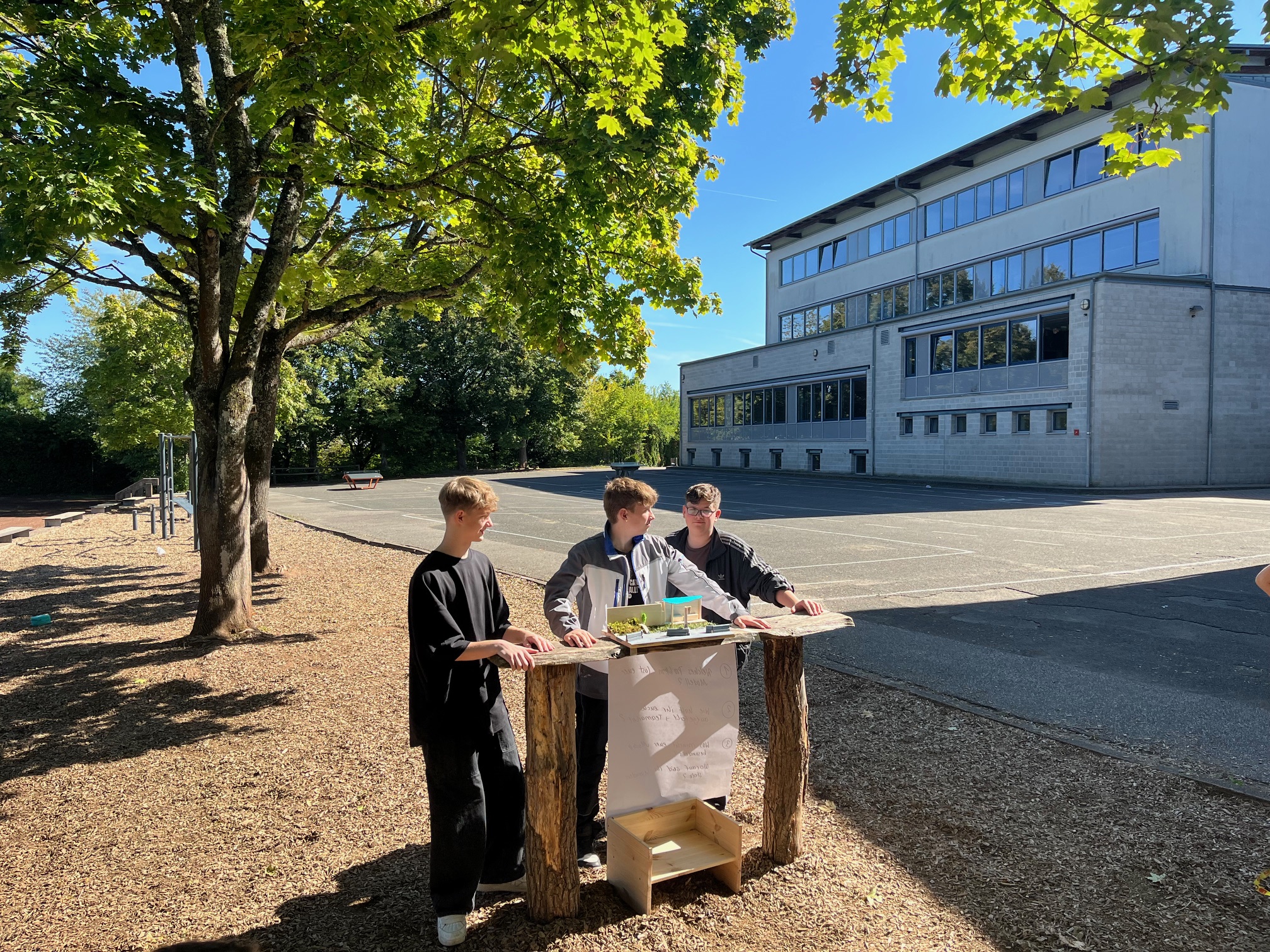 Am 18. und 19. September 2025 fand an unserer Schule im Rahmen der Berufsorientierung ein inspirierendes Projekt der Firma Hornbach und Forever Day One statt. 20 Schülerinnen und Schüler der 8. bis 10. Klassen nahmen an den beiden Tagen teil. Ziel des Projektes war es, einen Ort der Zukunft an unserer Schule zu finden und in einem Modell zu gestalten. Die Schüler hatten sich im Vorfeld den Bereich der Bushaltestelle vor der Schule ausgesucht. Mit Unterstützung von sechs Mitarbeitern von Hornbach und Forever Day One ging es nun an die Planung der Neugestaltung der Bushaltestelle.