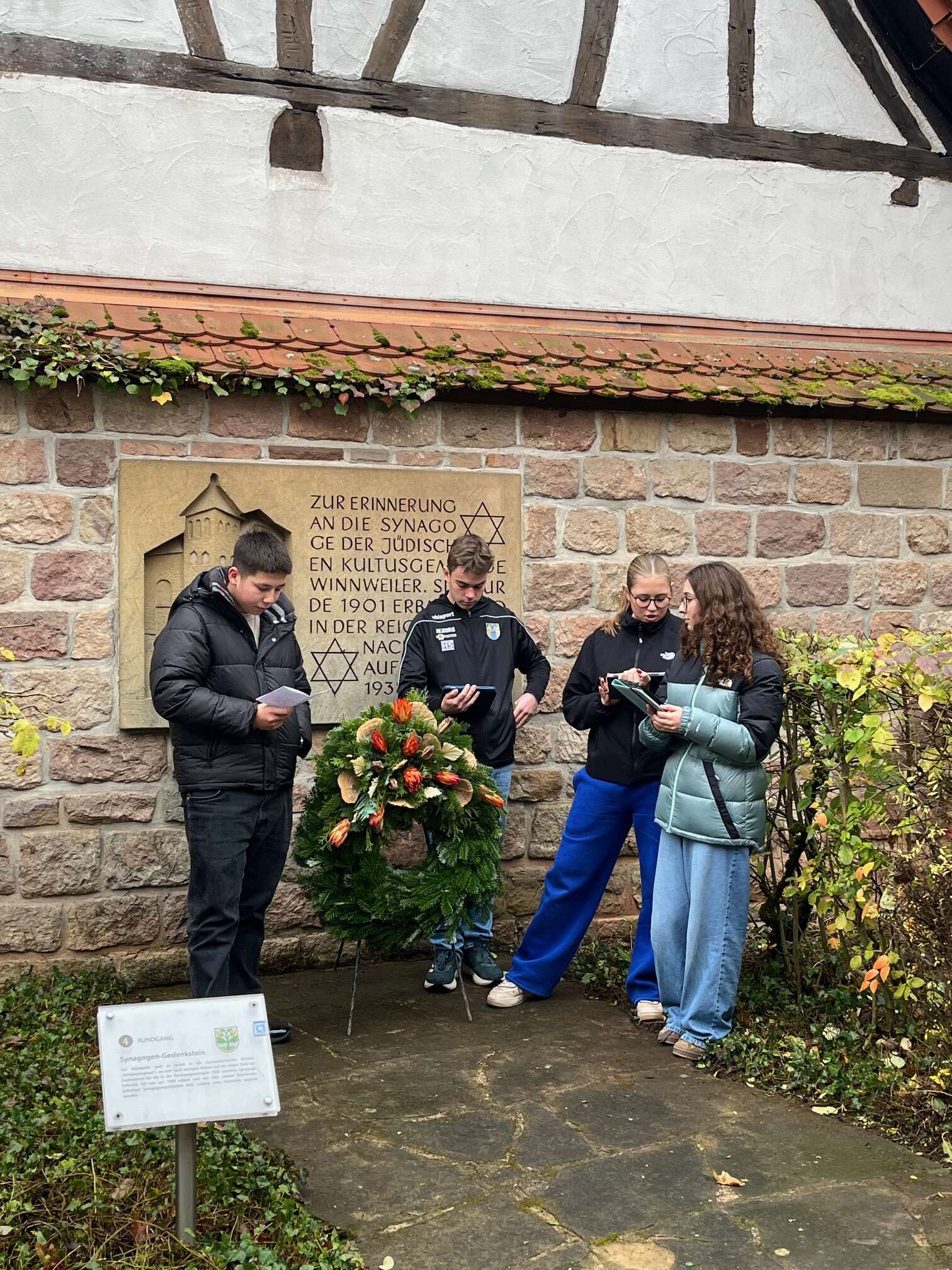 Wie in jedem Jahr trafen sich am 9. November Neunt- und Zehntklässler unserer Schule gemeinsam mit Schülerinnen und Schülern des Wilhelm-Erb-Gymnasiums Winnweiler, um der Opfer der Reichspogromnacht von 1938 zu gedenken. Die Veranstaltung, die inzwischen eine feste Tradition darstellt, soll ein Zeichen gegen das Vergessen setzen und jungen Menschen die Bedeutung historischer Verantwortung näherbringen.