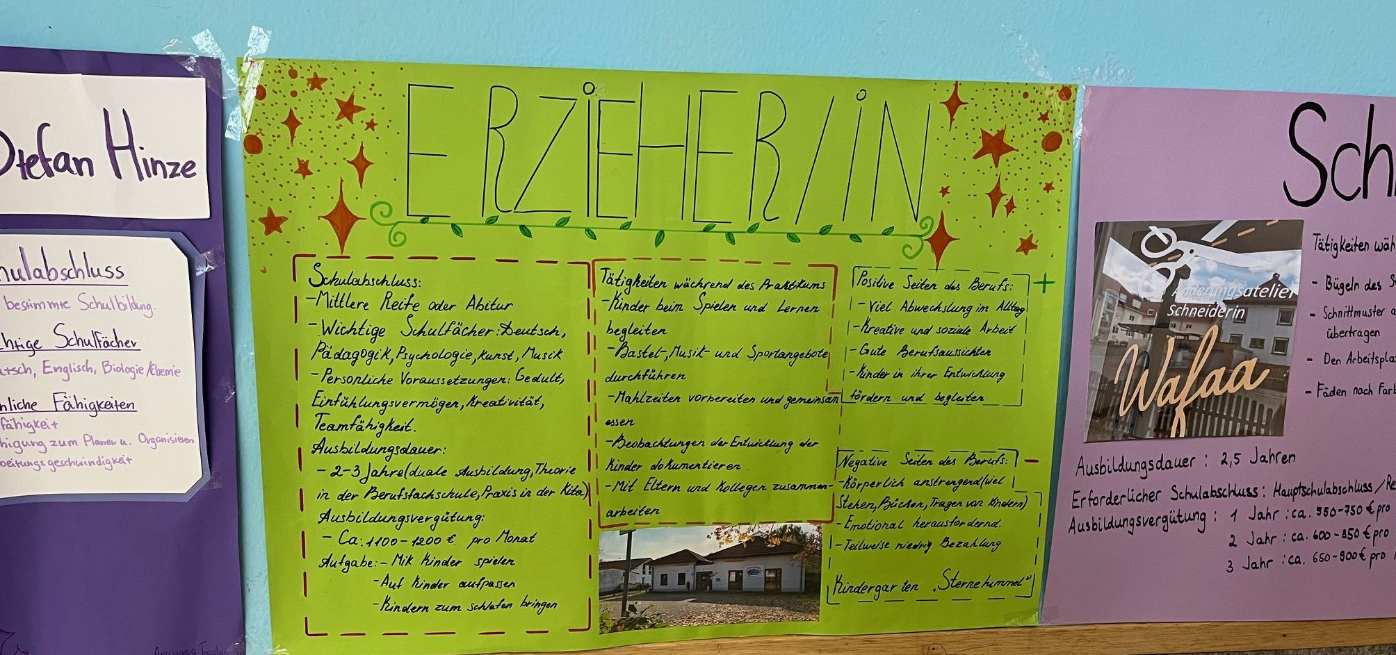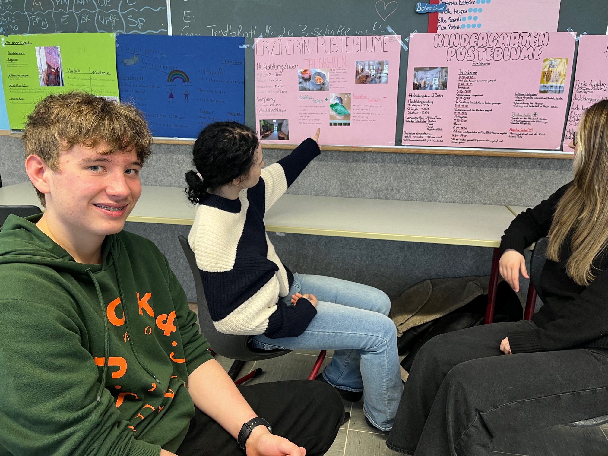 Diese Erfahrungen bildeten die Grundlage der internen Berufsmesse. Die Neuntklässler erarbeiten eigene Plakate, auf denen sie verschiedene Berufsbilder, Ausbildungswege sowie persönliche Erlebnisse aus ihren Praktika vorstellten. Während der Messe präsentierten sie ihre Ergebnisse den Achtklässlern, die sich interessiert über die unterschiedlichen Berufsfelder informierten.